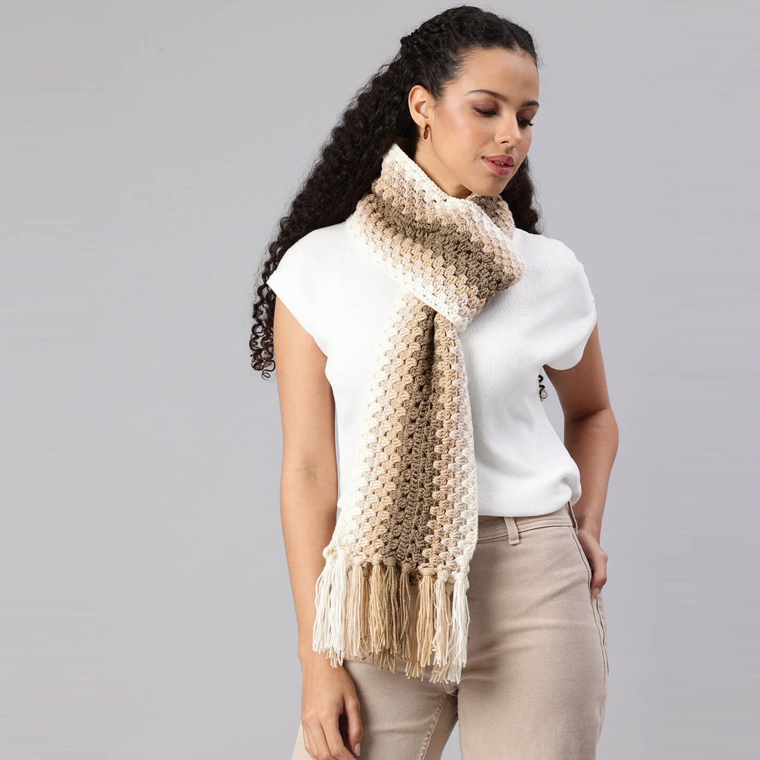 Brown Handmade Wave Pattern Crochet Scarf - 10494
