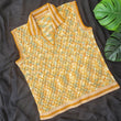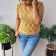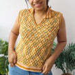 Heera Vest has textured diamond waffle stitches in the body that can go with pretty much anything. Nuanced diamond shapes run all over this top with suzette stitches around the collar and edging. When paired with a saree, skirt, palazzo, shorts, jeans, or trousers, this top makes a perfect summer/light winter ensemble.
