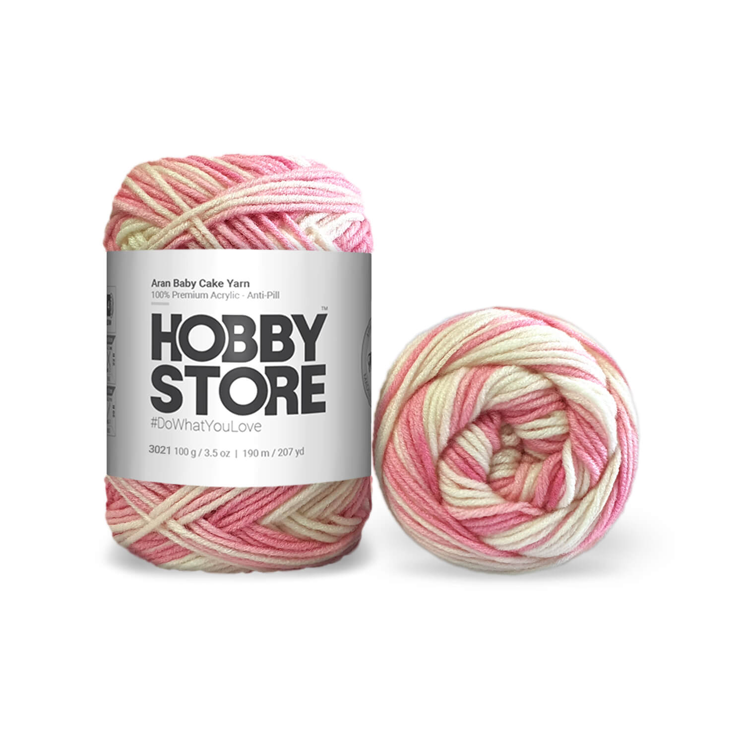 Hobby Store Aran Baby Cakes anti-pill premium acrylic cake yarn is a fuzzy and warm medium weight yarn with a smooth suede-like finish. With its vibrant shades and the play of colors, Hobby Store Aran Baby Cake yarn will make any project you work on stand out. Each ball features four to five colors, and the color play makes your project stand out.